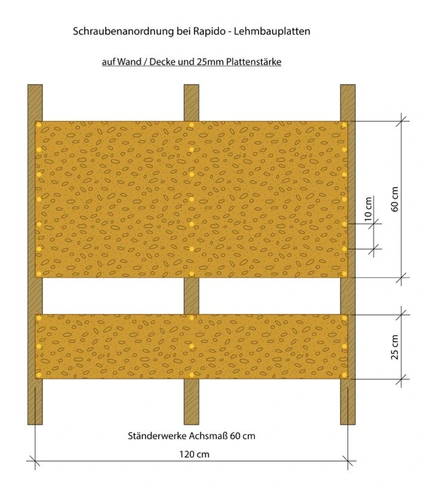 Rapido-Lehmbauplatten lassen sich ebenso unkompliziert verarbeiten wie herkömmliche Gipskartonplatten. Zum Zuschneiden genügt das Ritzen und Brechen mit einem Messer. Die Montage erfolgt mit einem Klammerschussgerät oder Großkopfschrauben, die je nach Unterkonstruktion verwendet werden können. Im Gegensatz zu vielen anderen Lehmplatten können Rapido-Lehmbauplatten nahe am Rand verschraubt oder genagelt werden, ohne dass Abplatzungen entstehen – ein Vorbohren ist nicht erforderlich.
